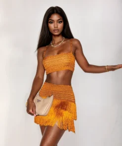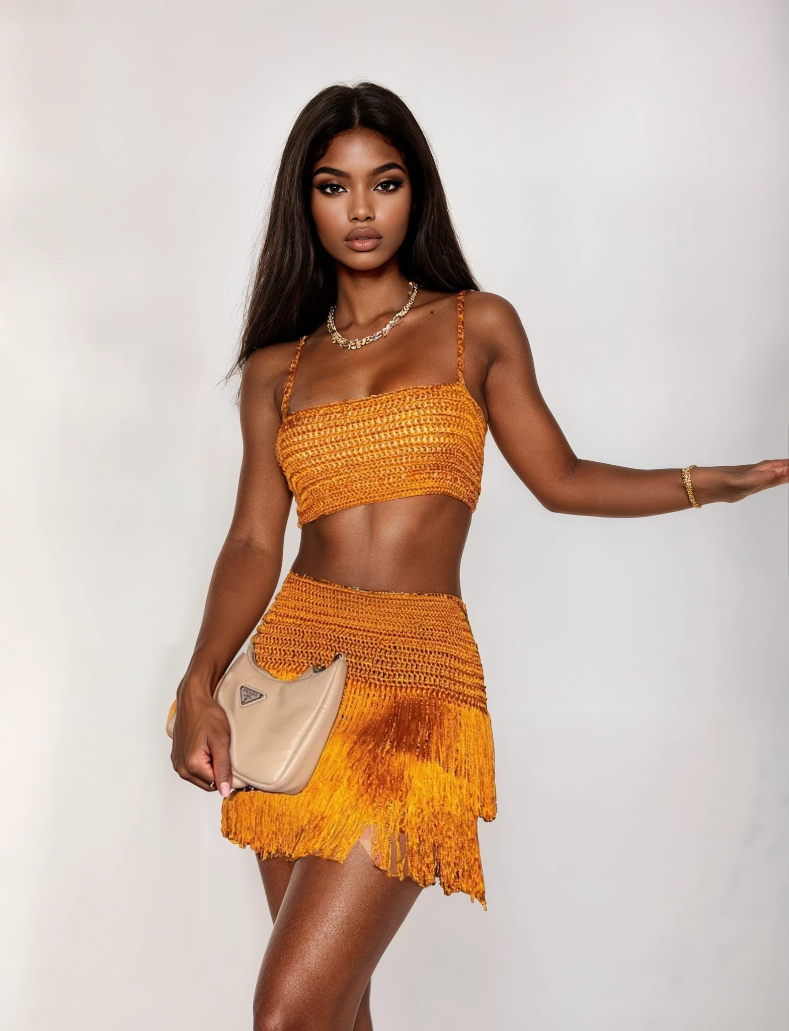 • Saia de cintura alta com acabamento em franjas artesanais que criam um movimento incrível a cada passo – sensual e leve na medida certa.