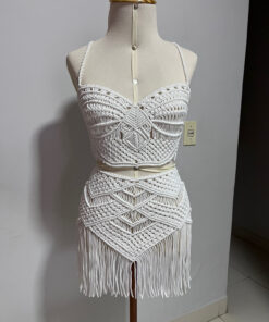 Leve, artesanal e absolutamente encantador, o Conjunto Verano é a tradução perfeita do luxo despretensioso à beira-mar. Confeccionado em macramê manual, ele traz um trabalho minucioso de tramas geométricas que valorizam o corpo com elegância e sensualidade na medida certa.