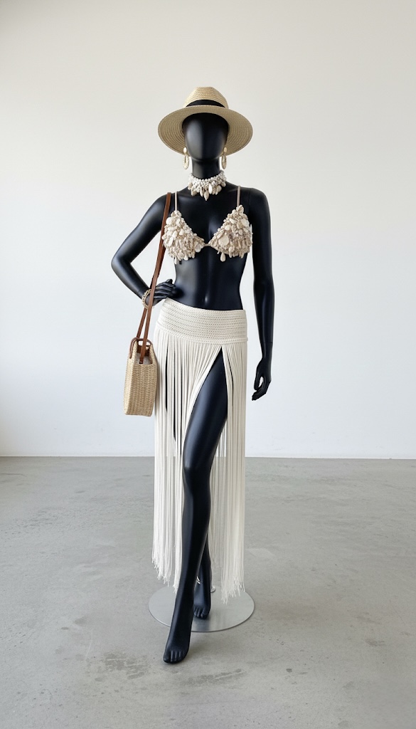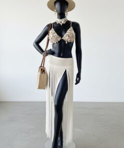 Um sonho artesanal composto pela saia em seda fluida, que dança ao vento com leveza hipnotizante, e pelo top bordado à mão em madrepérolas e búzios naturais, acompanhado de um choker exclusivo, que transforma o look em um verdadeiro statement de estilo.
