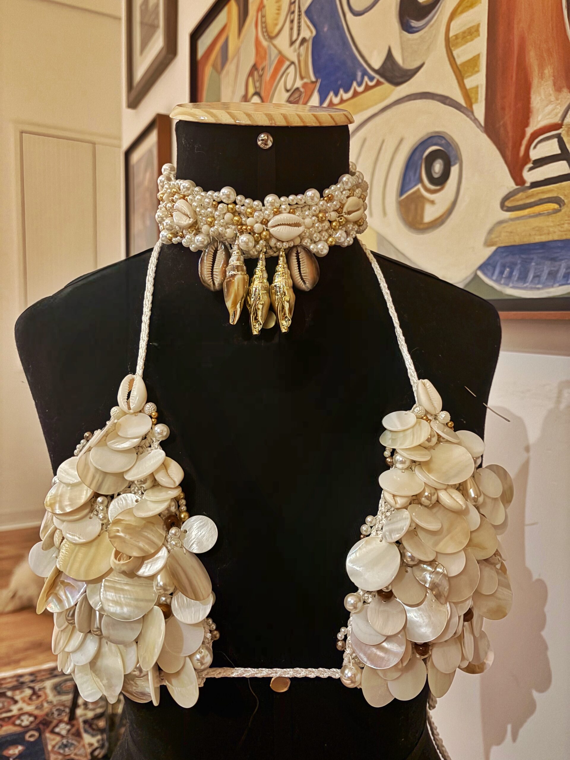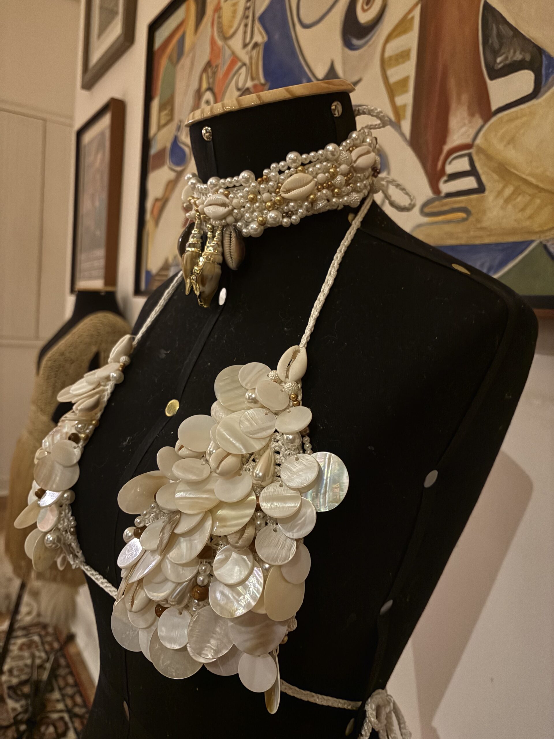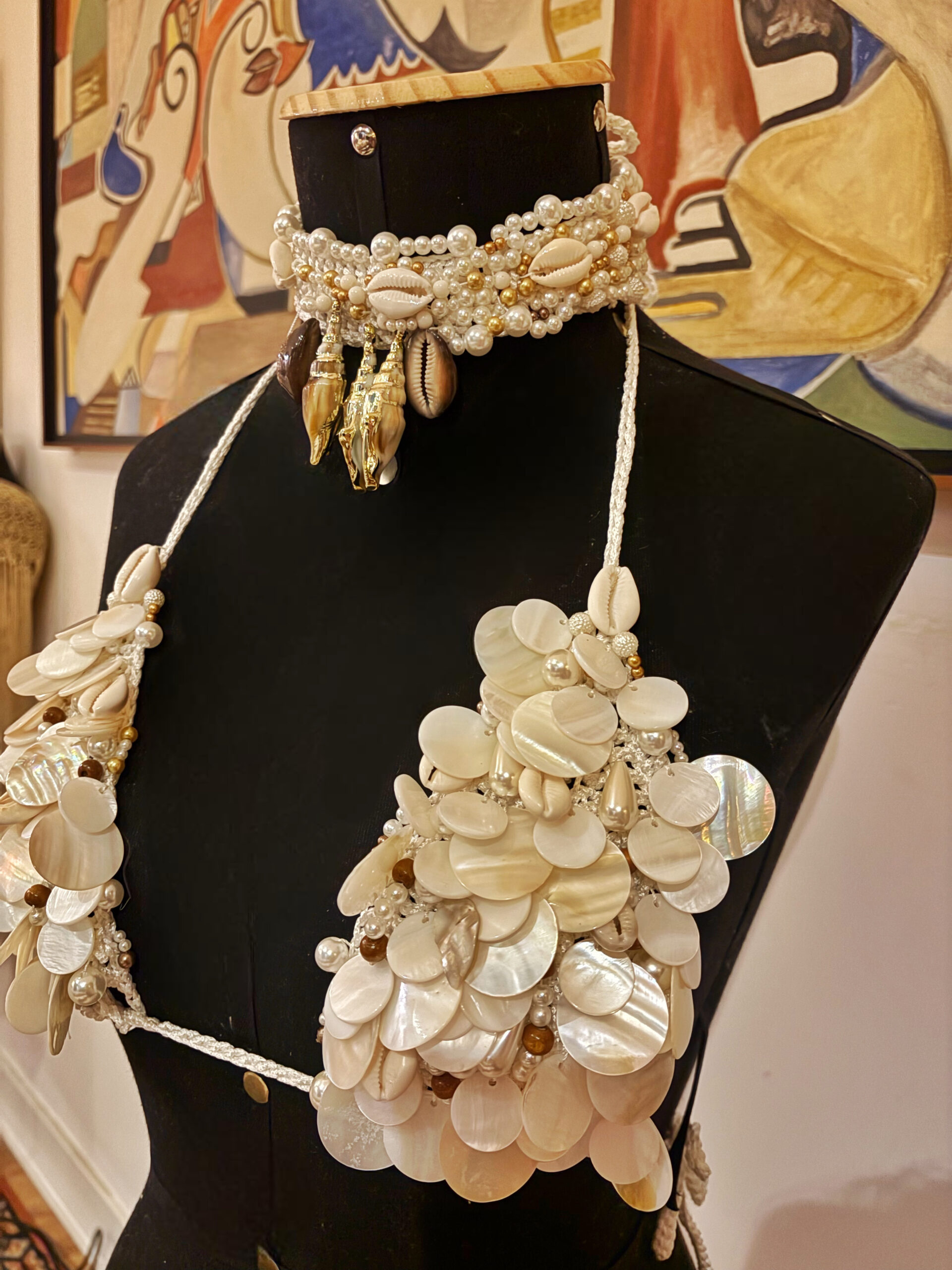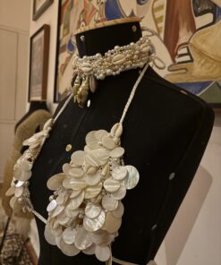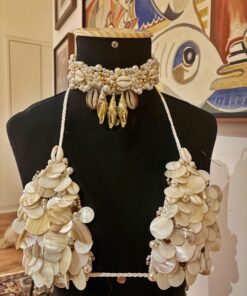 Um sonho artesanal composto pelo top bordado à mão em madrepérolas e búzios naturais, acompanhado de um choker exclusivo, que transforma o look em um verdadeiro statement de estilo.
