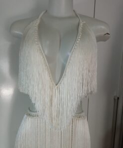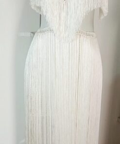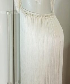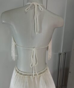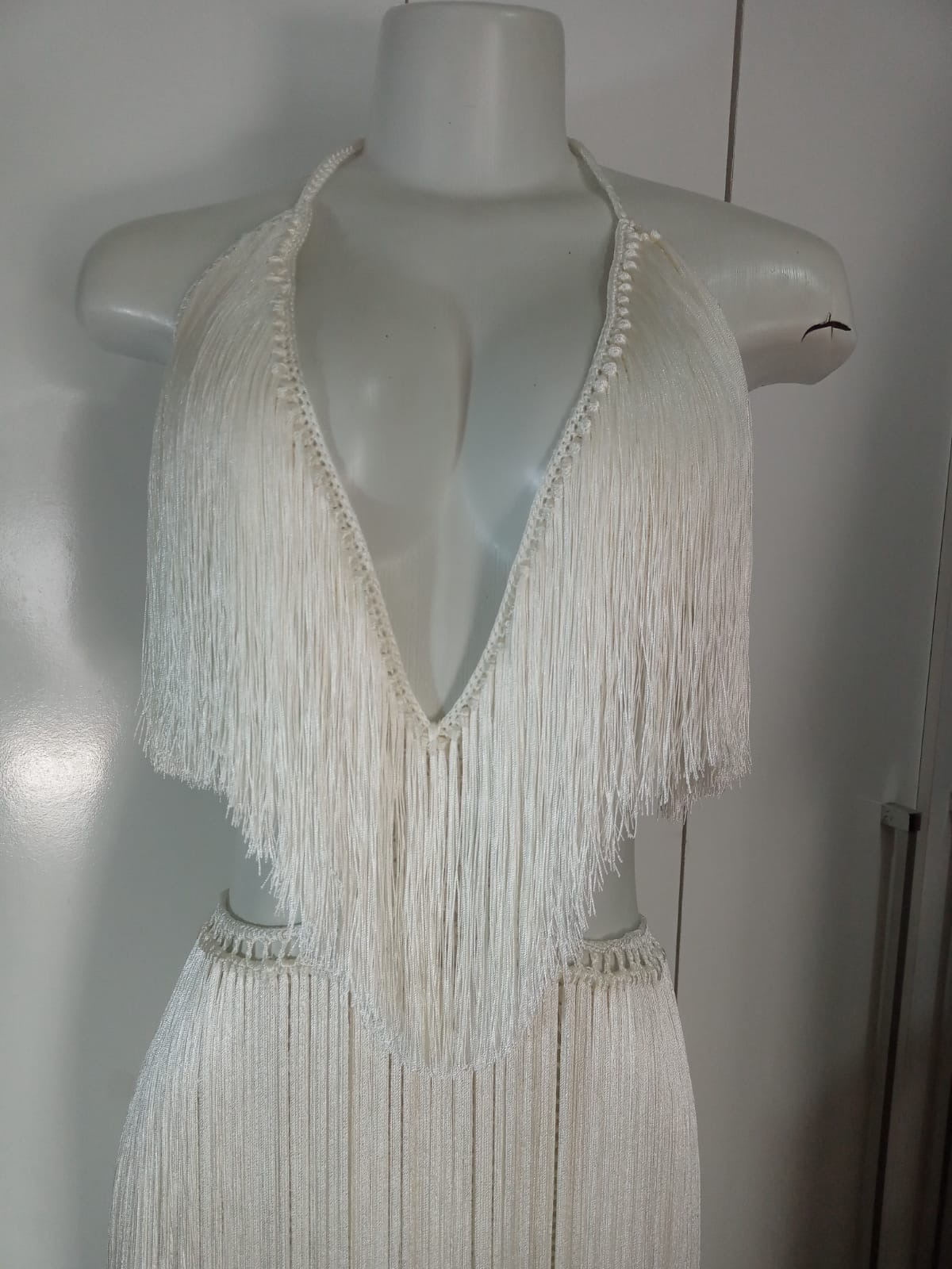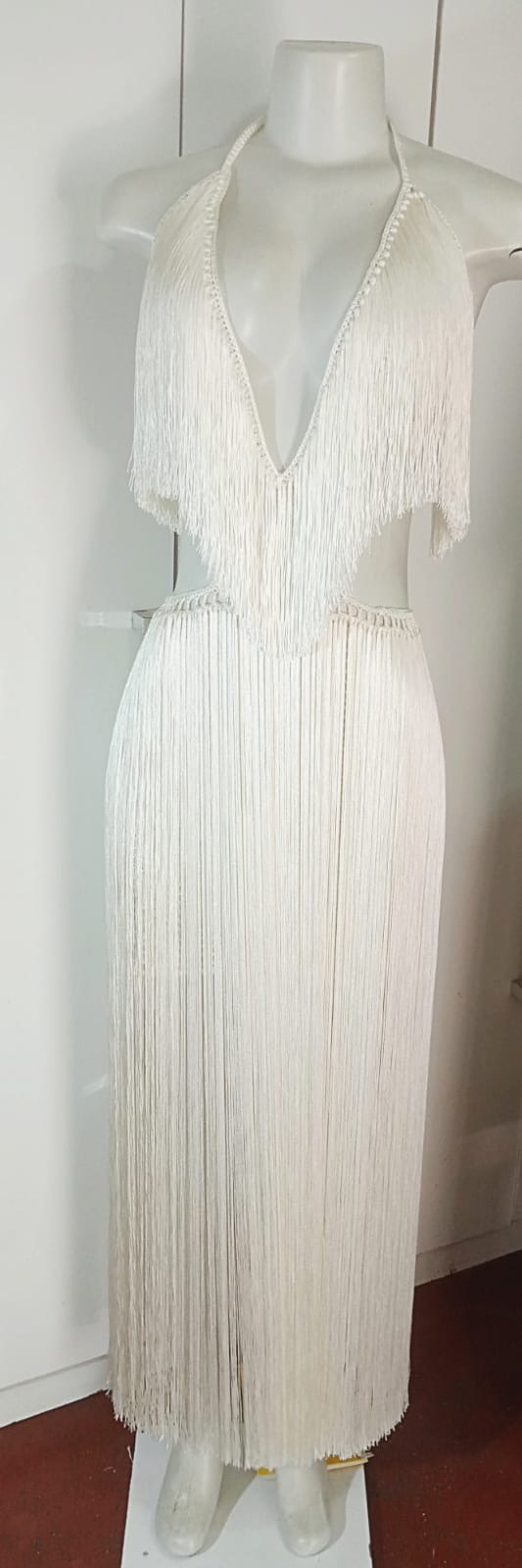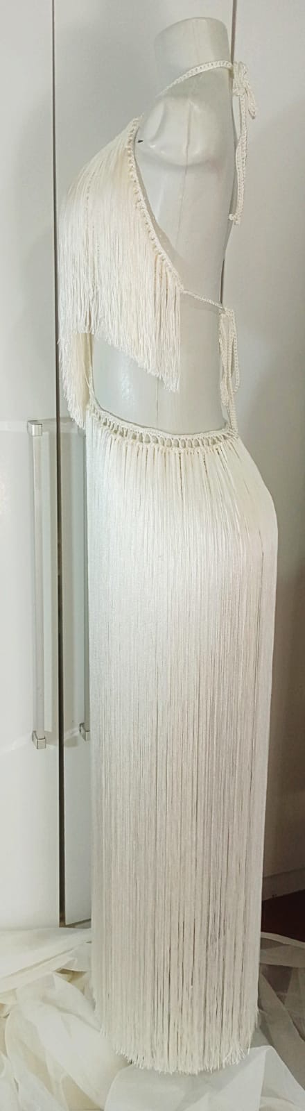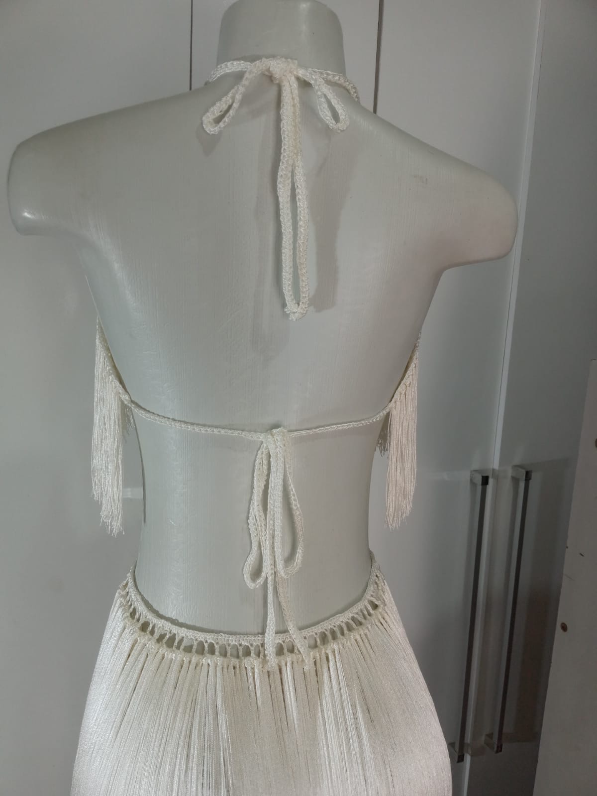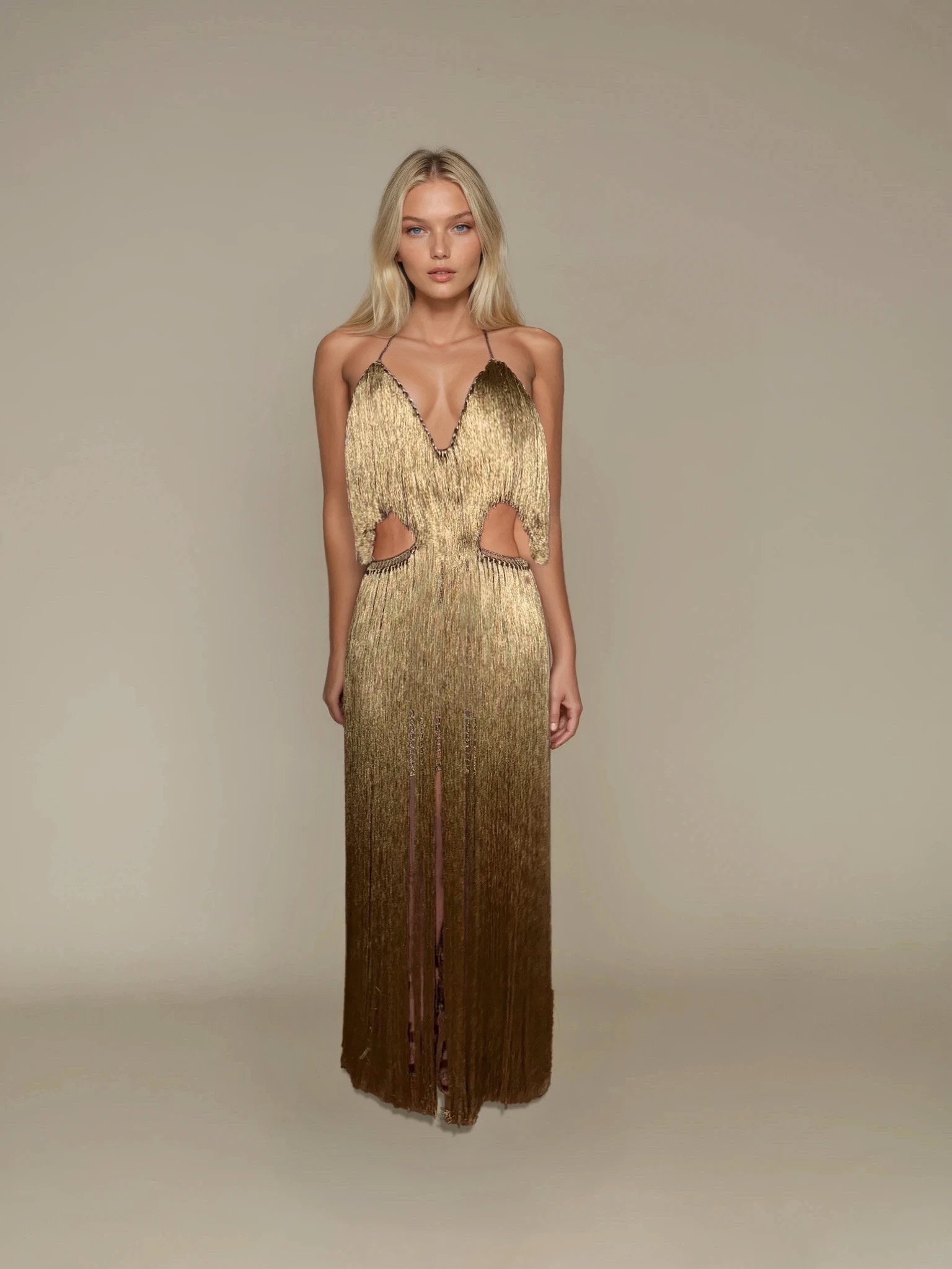 Sinta-se uma deusa com o Vestido Marrakesh, feito artesanalmente em crochê com fios de seda dourados que capturam e refletem a luz a cada passo. Um modelo de impacto, com franjas longas e fluídas que acompanham os movimentos do corpo com leveza e magnetismo.