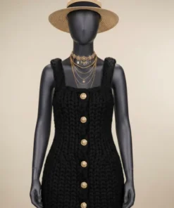 O design com botões frontais dourados adiciona um toque clássico e refinado, enquanto as alças estruturadas e a modelagem ajustada desenham a silhueta com elegância e presença.