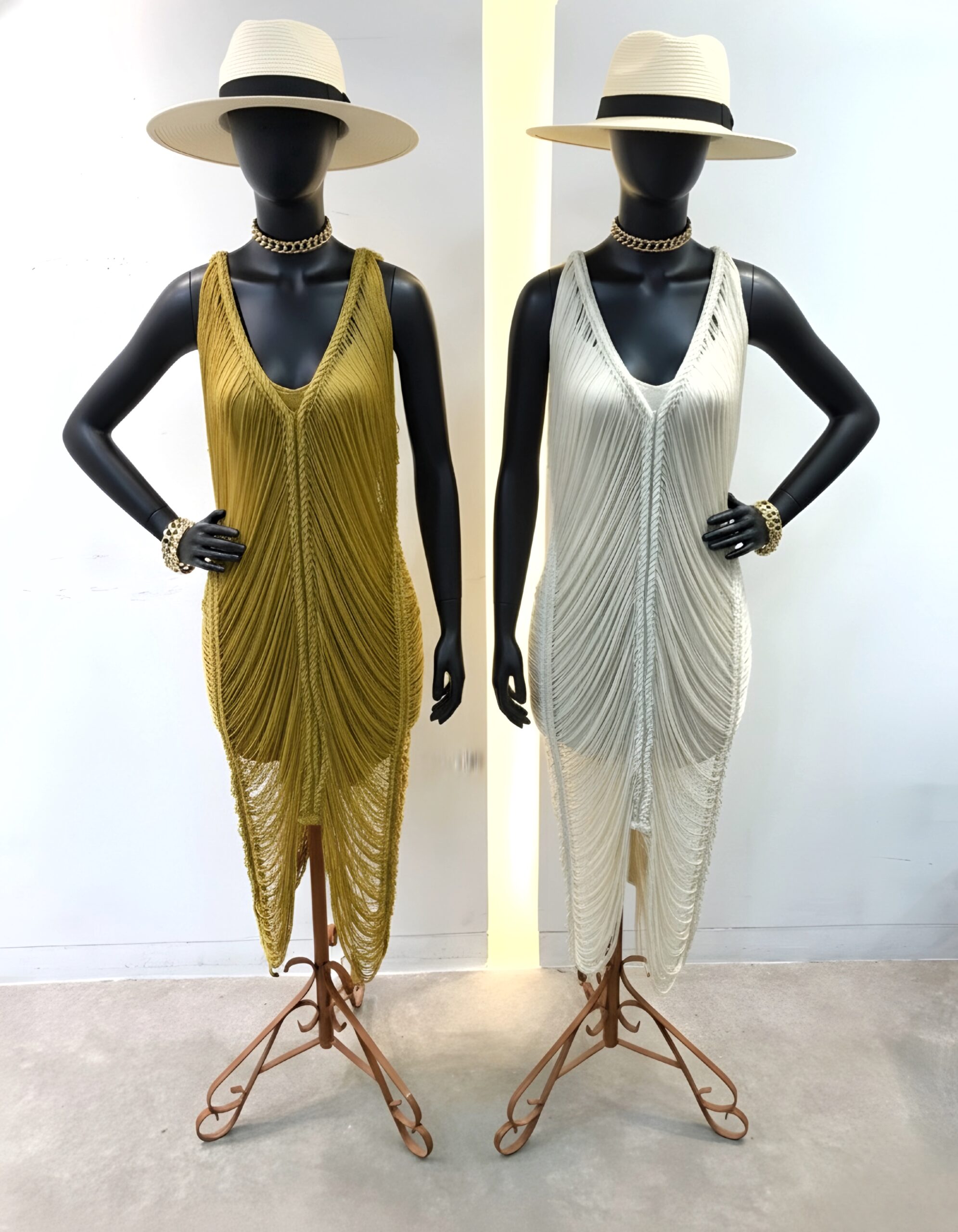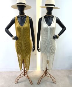 O Vestido Trancoso foi feito para quem quer brilhar sem esforço. Confeccionado em fio Rayon com uma camada de franjas de seda que se movem a cada passo, ele cria um efeito hipnotizante de balanço e luminosidade — perfeito para quem ama causar impacto.