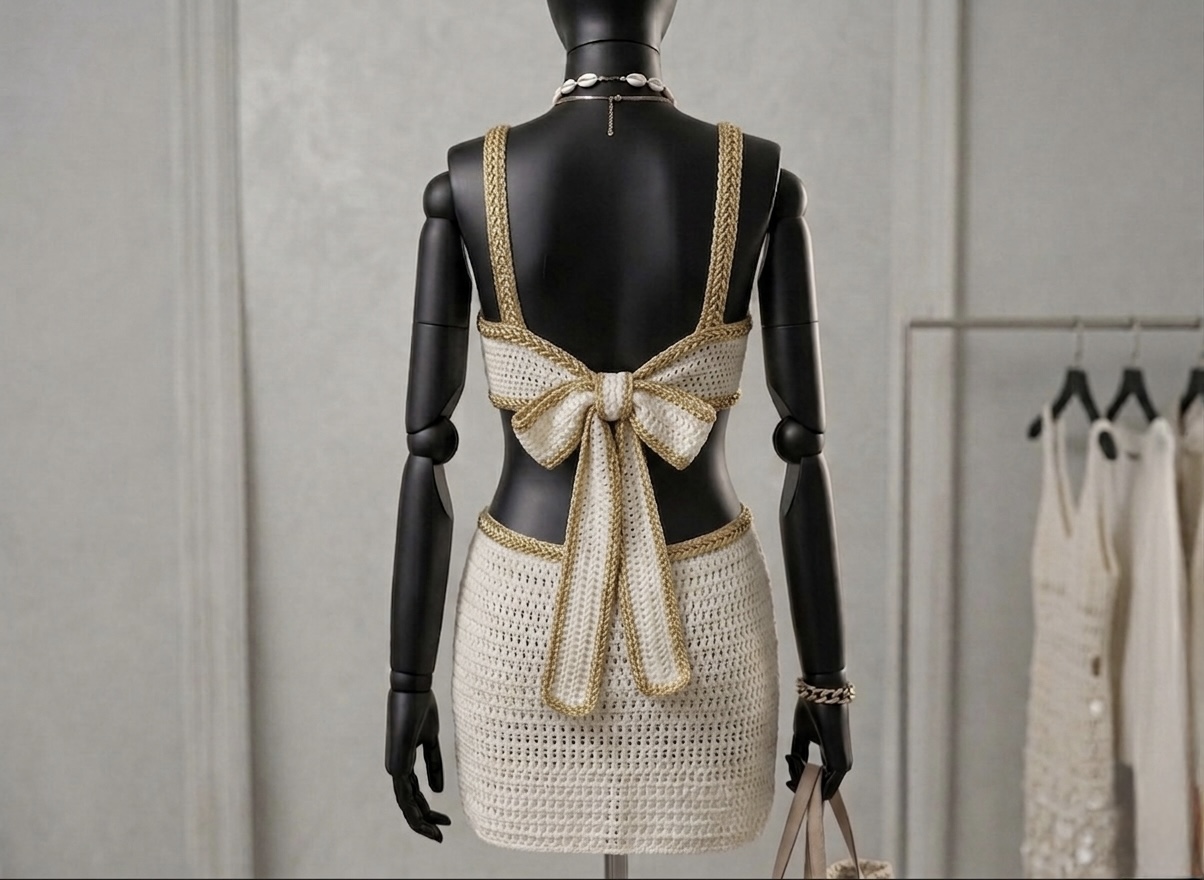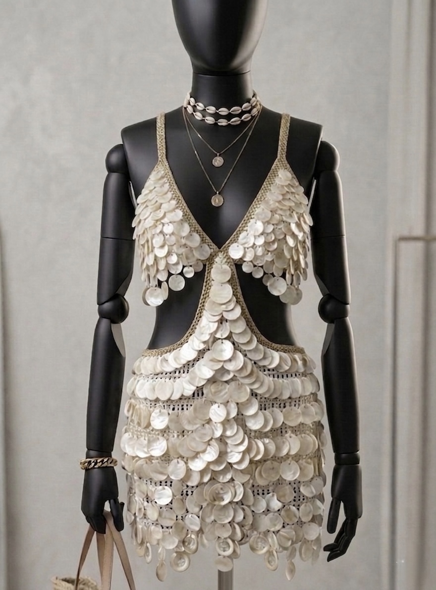 O Vestido Trancoso é a tradução perfeita do luxo artesanal com alma praiana. Feito em crochet manual e cuidadosamente bordado com madrepérolas naturais, ele reflete a luz com um brilho sofisticado e único — como o pôr do sol à beira-mar.